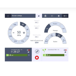 Dwukanałowy aparat do elektroterapii z kolorowym wyświetlaczem dotykowym oraz dwukanałowym modułem podciśnienia.