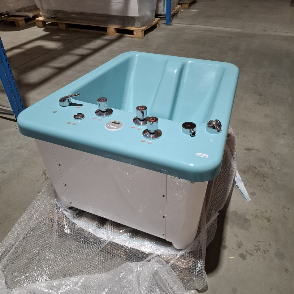Urządzenie do hydroterapii umożliwiające rehabilitację stóp i podudzi z wykorzystaniem delikatnego masażu wirowego. Urządzenie do masażu wirowego stóp i podudzi jest wyposażone w trzydzieści osiem funkcjonalnych dysz powietrznych.