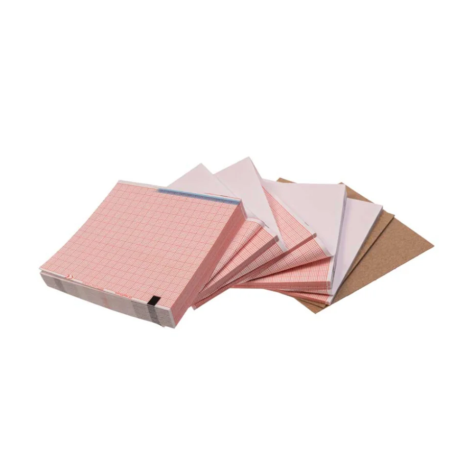 Papier posiada nadrukowaną czerwoną kratkę milimetrową, która umożliwia dokładny pomiar parametrów EKG, takich jak amplituda i czas trwania załamków czy odstępów, a składana forma (Z-fold) ułatwia podawanie i eliminuje problem zwijania się arkuszy.