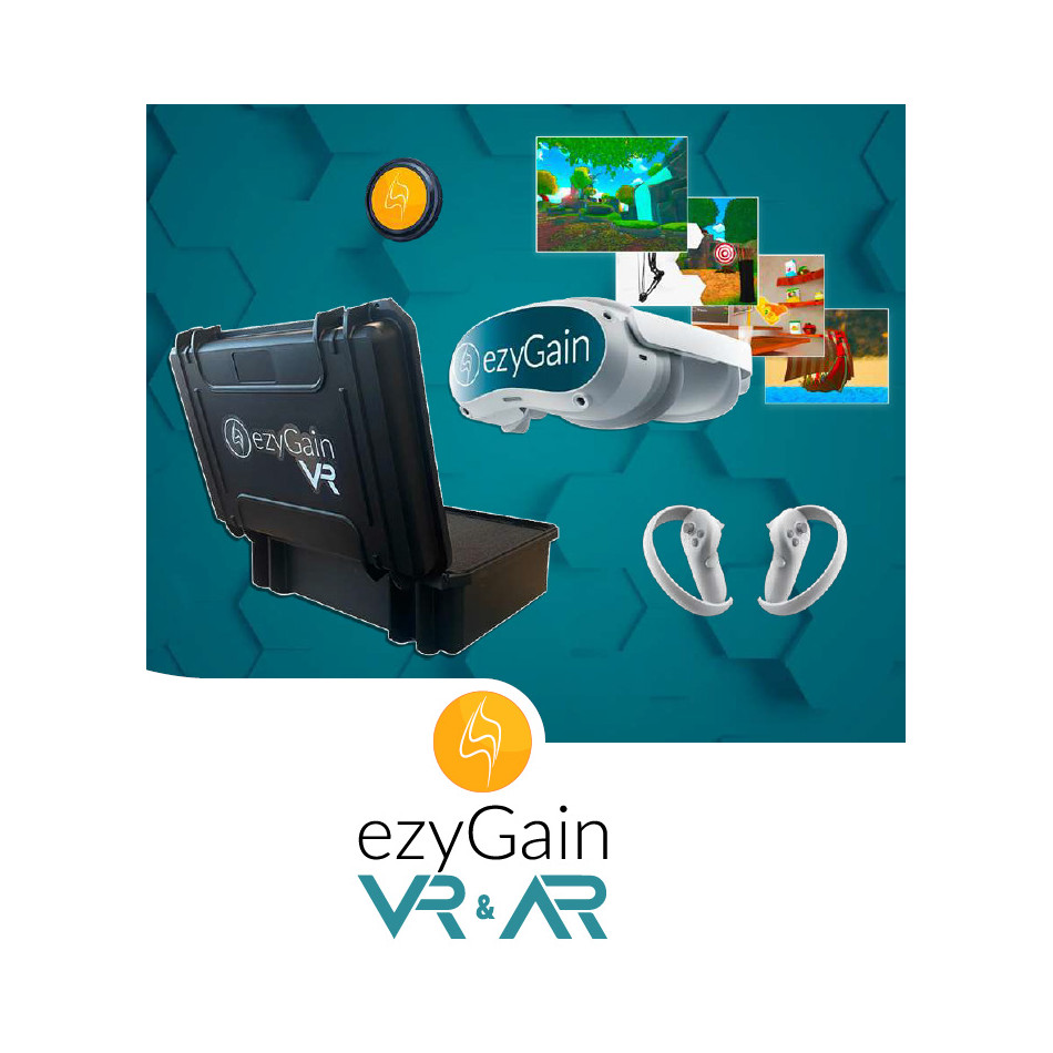Zestaw EzyGain VR Kit to prosty i niedrogi system wirtualnej rzeczywistości do efektywnej i motywującej rehabilitacji. Zestaw składa się z gogli VR i dwoch kontrolerów. Urządzenie oferuje immersyjne środowiska umożliwiające wykonywanie ćwiczeń poznawczych, trening chodu, równowagi, kończyn górnych i małej motoryki.