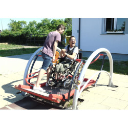Dla osób z niepełnosprawnościami szczególnie cenny jest aspekt „sprawczości” polegający na wprawianiu huśtawki w ruch poprzez odpycha- nie się kończynami górnymi od rękojeści. Jeżeli osoba z niepełnosprawnością nie jest w stanie napędzać urządzenia, wystarczy, że czynność tą wykonuje osoba pełnosprawna uczestnicząca w zabawie.