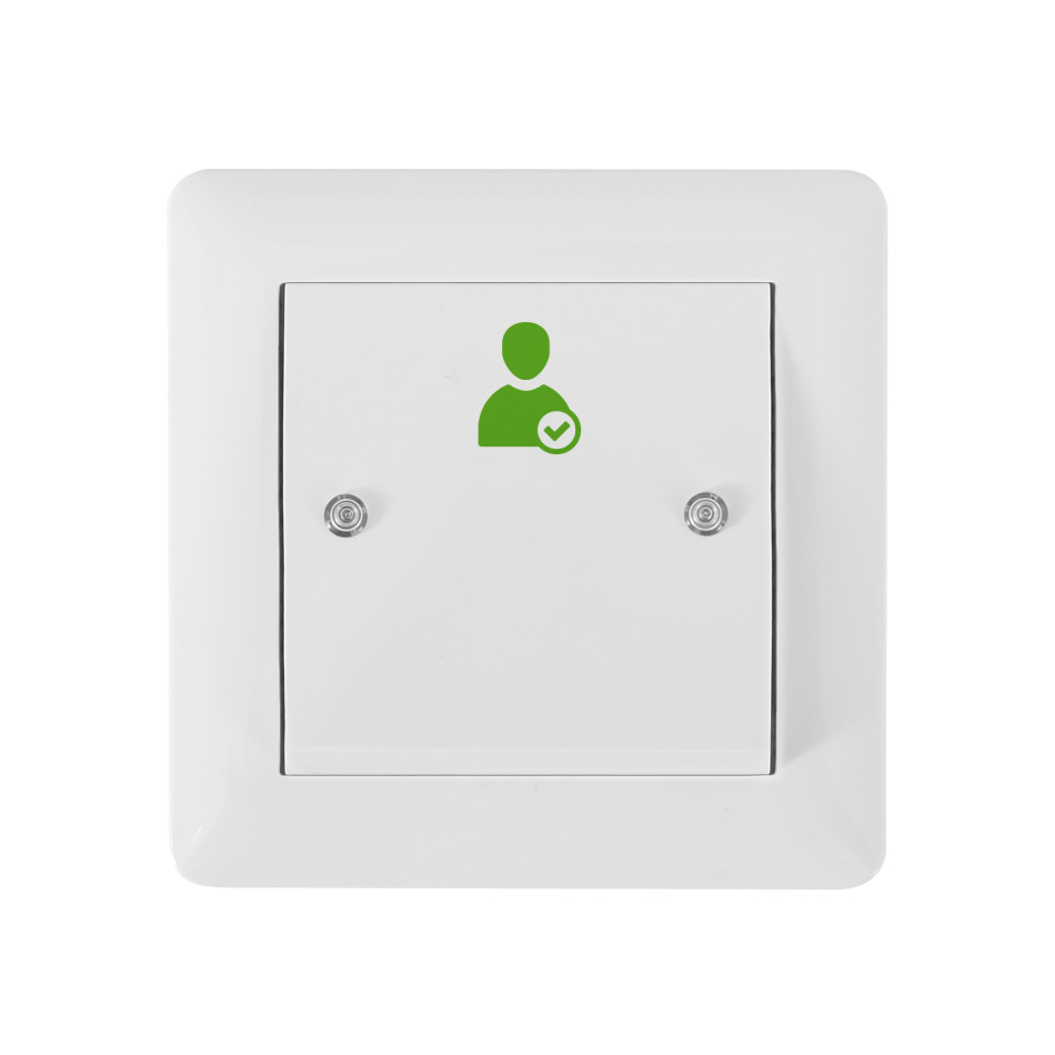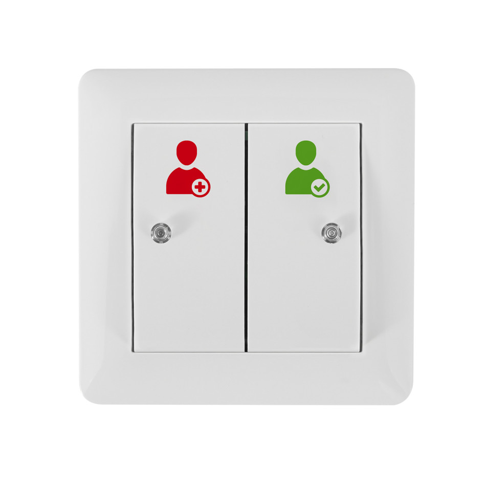 Przycisk tego typu umożliwia potwierdzenie obecności personelu lub/i skasowanie wezwań – zwykłych, pomocy i alarmów.