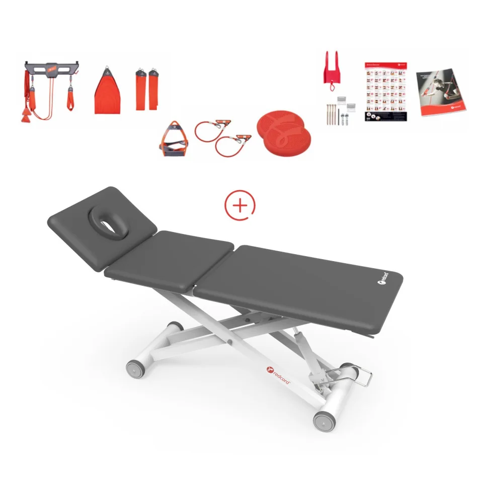 Kompletne rozwiązanie dla nowoczesnej fizjoterapii i treningu sportowego. Stół masażu Nexus z 4-sekcyjną regulacją w kolorze grafitowym zapewnia precyzyjne pozycjonowanie pacjenta podczas zabiegów terapeutycznych. W zestawie system REDCORD ACTIVE PRO do ćwiczeń w podwieszeniu, idealny do rehabilitacji sportowej i treningu funkcjonalnego. Połączenie tradycyjnej terapii manualnej z innowacyjnymi metodami treningowymi umożliwia kompleksową opiekę nad pacjentem - od masażu relaksacyjnego po zaawansowaną rehabilitację sportową.